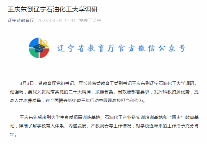 编者按:近日,辽宁省教育厅微信公众号发布文章对省教育厅党组书记、厅长兼省委教育工委副书记王庆东到我校调研进行了宣传报道。现将相关报道转载如下: