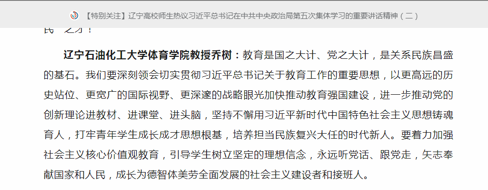 编者按:6月1日,辽宁高校思政微信公众号以《辽宁高校师生热议习近平总书记在中共中央政治局第五次集体学习的重要讲话精神(二)》为题,组稿刊登了我校体育学院教授乔树的感悟。现将相关报道转载如下: