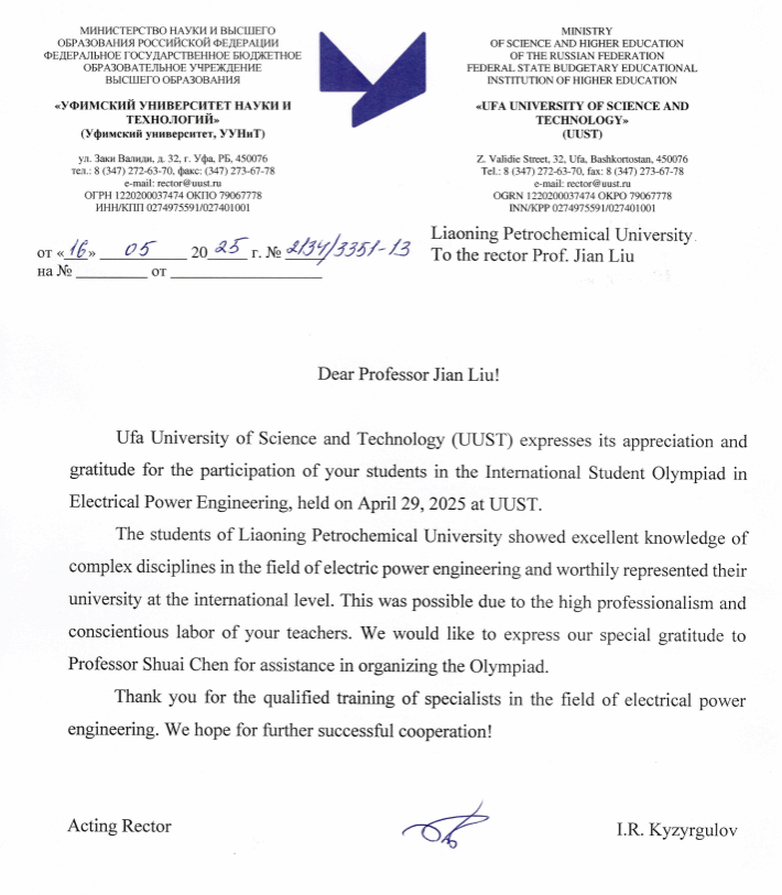 近日,俄罗斯乌法科技大学校长伊・拉・克孜尔古洛夫特向学校党委副书记、牵头负责行政工作副校长刘坚发来信函,对我校学生于2025年4月29日参加在乌法科技大学举办的国际电力工程奥林匹克竞赛表示衷心感谢。